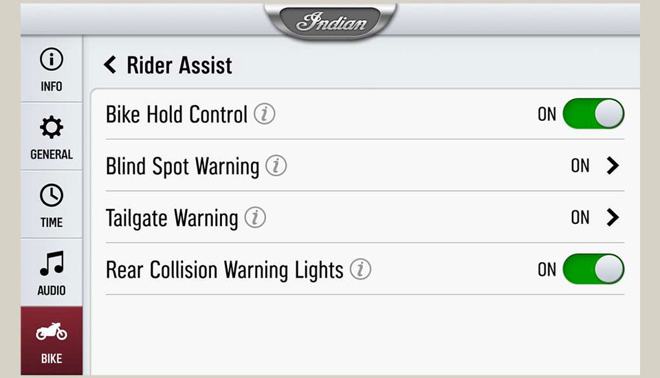 La configuration des fonctions du Rider Assist est accessible via l'écran des paramètres du Rider Assist. Une personnalisation plus poussée de l'avertisseur d'angle mort et de l'avertisseur de suivi peut être effectuée via le sous-menu des caractéristiques sélectionnées.
